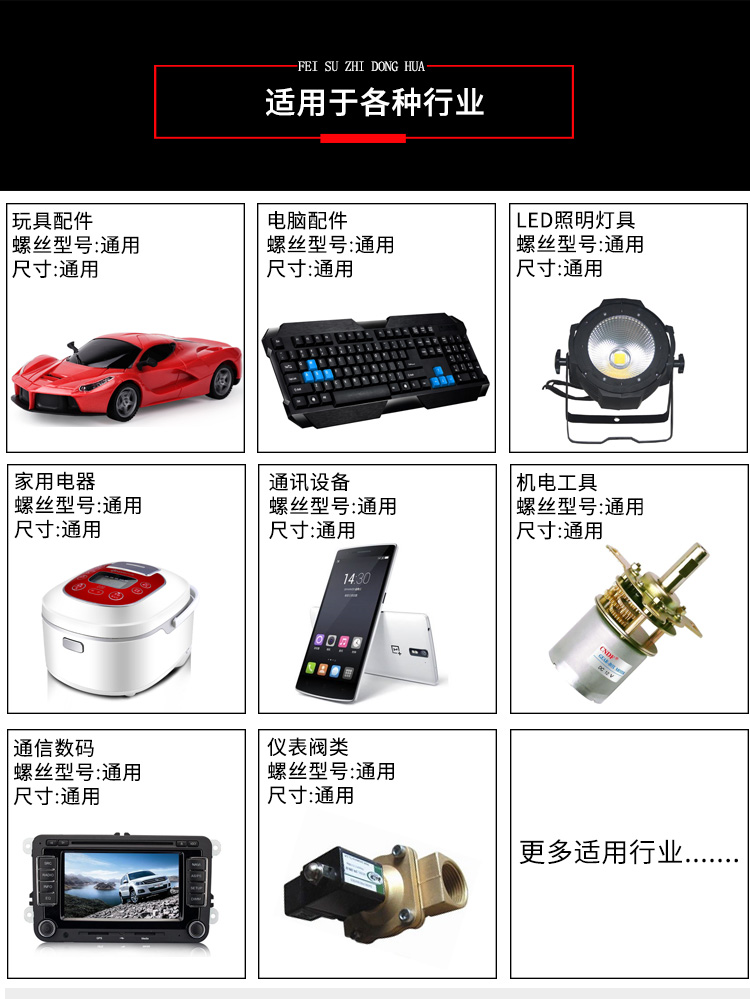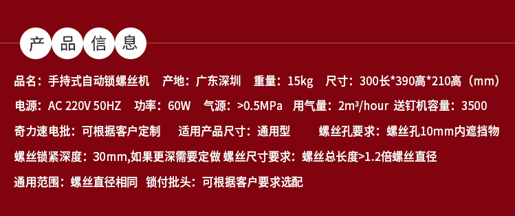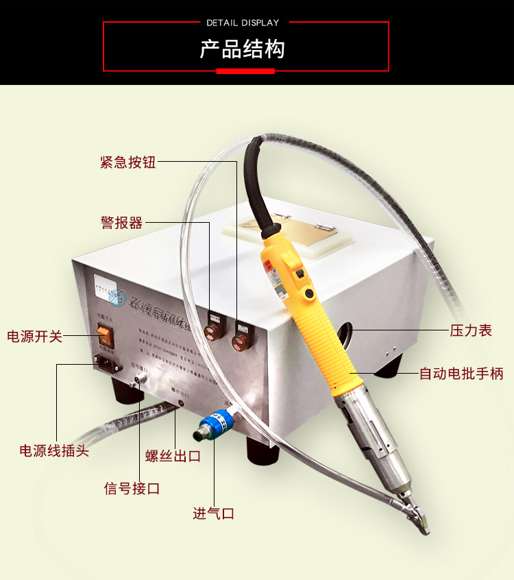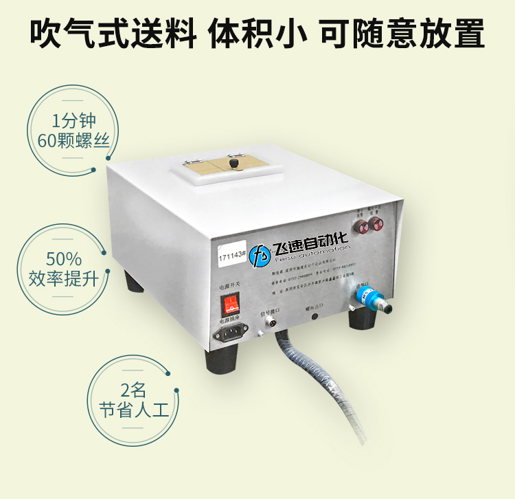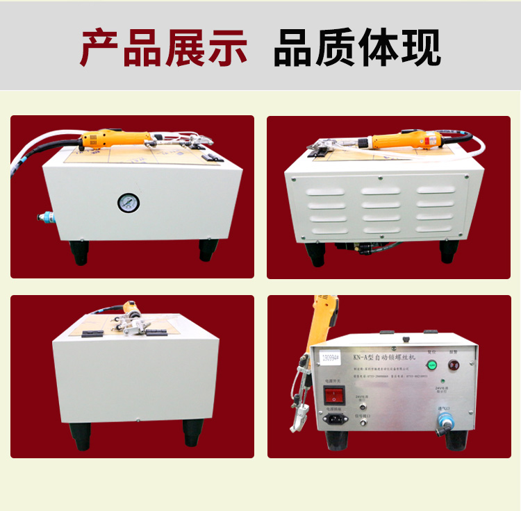 - 產(chǎn)品簡介: 手持式自動打螺絲機(jī)也叫自動供料鎖螺絲機(jī)、自動擰螺絲機(jī)等,嚴(yán)格來講,手持式只能算是半自動,因為它還是需要手工操作。一臺手持式自動鎖螺絲機(jī)主要由兩部分組成:自動供料機(jī)和電批,其中自動供料機(jī)是重要的,也是復(fù)雜的,它的好壞直接關(guān)系到機(jī)器卡不卡料的問題。1.采用渦輪上料,體積和噪音小、重量輕,可存放在工作平臺上,節(jié)省空間; 飛速手持式螺絲機(jī): 1.螺絲自動排列、供料,自動篩選異型螺絲,自動補(bǔ)給空料,無料會自動報警; 2.送料采用感應(yīng)器控制,鎖付完一顆來一顆,自動送料,不會出現(xiàn)重復(fù)給料現(xiàn)象; 3.滑牙不送料:在鎖付工程中,扭力達(dá)不到,螺絲不送出,防止批嘴出現(xiàn)卡料現(xiàn)象; 4.穩(wěn)定性好,不卡料,即使不良導(dǎo)致卡料,非專業(yè)人員也可以在幾秒鐘內(nèi)解決卡料; 5.效率高,一般1秒鐘打一個螺絲,不用抓起螺絲,只需對準(zhǔn)螺絲孔位鎖緊螺絲即可; 6.可減少1到2個工人螺絲鎖付作業(yè),實(shí)現(xiàn)半自動化生產(chǎn),降低工人的勞動強(qiáng)度,提高生產(chǎn)率; 7.關(guān)鍵部位采用高品質(zhì)五金材料并經(jīng)過特殊處理,電子原器件采用原裝進(jìn)口,確保設(shè)備零故障。 產(chǎn)品適用范圍 1.適用于各種類型的螺絲,螺絲總長應(yīng)大于1.3倍螺帽直徑; 2.支持深孔螺絲鎖付,孔深小于40mm,M1-M6的螺絲; 3.適用于數(shù)碼、電子、小家電、電源開關(guān)、燈具、LED、玩具等產(chǎn)品。