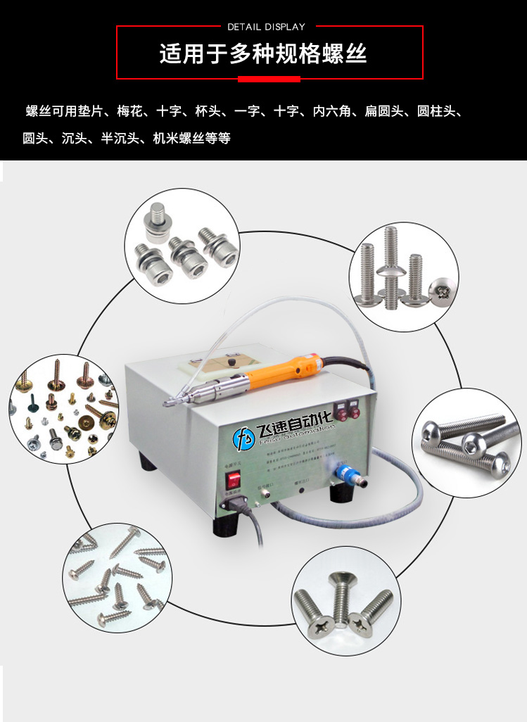 手持式螺絲機(jī)使用方法 深圳市飛速自動化設(shè)備有限公司專注自動鎖螺絲設(shè)備生產(chǎn)設(shè)計,擁有臺灣進(jìn)口CNC、自動化數(shù)控設(shè)備、鉆床、銑床、線切割、精密自動車床等加工機(jī)設(shè)備50多臺套,是一家集方案設(shè)計、研發(fā)、制造、加工為一體的實(shí)力生產(chǎn)商。近年來為適應(yīng)企業(yè)自動化生產(chǎn)需求,公司研發(fā)多種系列自動化鎖螺絲設(shè)備,廣泛用于通信、電子、電器、電腦、燈飾、玩具、建材、汽車等制造業(yè)。 熊先生:13923485762